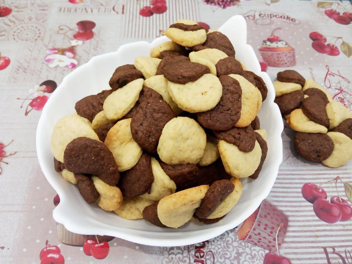 Разделите тесто на две части: в одну добавьте оставшуюся муку, в другую – какао и одну ложку муки, замесите обе части до однородности.