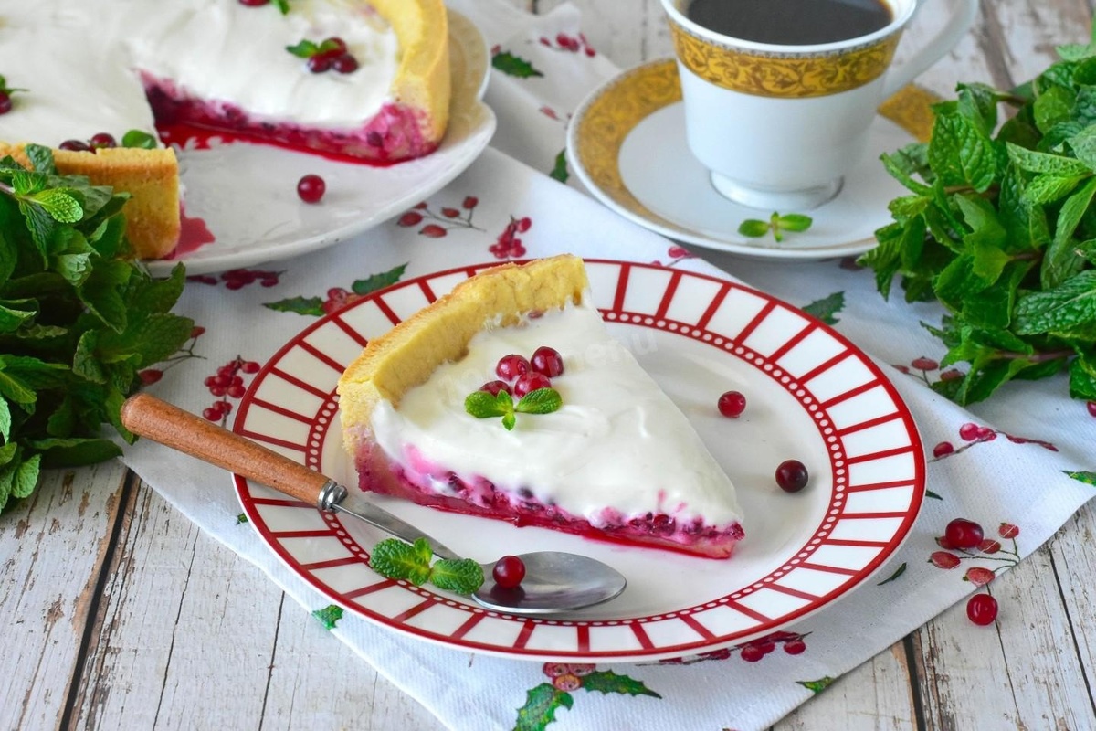 Пирог с брусникой и сметанным кремом готов к подаче на стол. Наслаждайтесь!