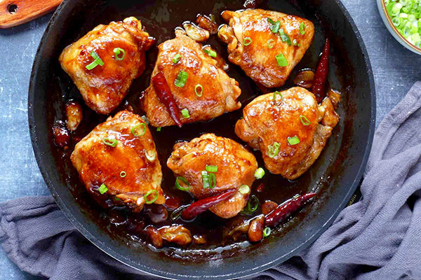 Смешайте все ингредиенты для соуса и влейте получившуюся смесь в сковороду. Если желаете, добавьте сушёные чили. Накройте крышкой и тушите на среднем огне 15 минут, потом переверните курицу и готовьте ещё 10 минут.