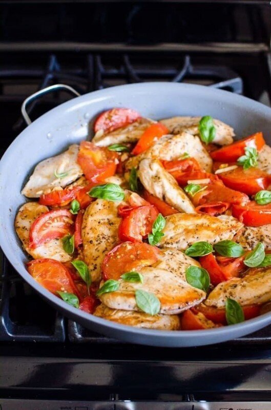 4. В конце добавьте обжаренную курицу обратно к соусу, перемешайте и дайте всему настояться. При подаче посыпьте готовое блюдо свежей зеленью базилика.