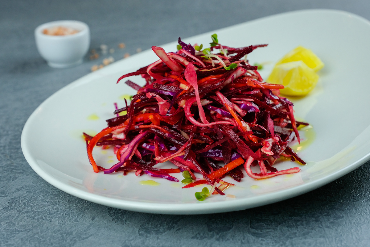 Этот рецепт салата порадует любителей легкой и здоровой пищи. Простые ингредиенты — капуста, морковь, свекла и яблоко — в сочетании с пряным имбирем и лимонной заправкой создают необыкновенно яркий и свежий вкус.