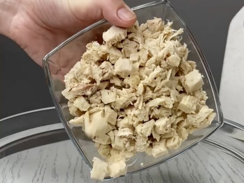 Для приготовления салата необходимо отварить куриную грудку в подсоленной воде, оставив её остывать в бульоне, чтобы мясо не стало сухим. Если есть свободное время, можно запечь грудку в духовке — это придаст блюду дополнительный вкус.