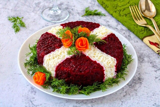 Теперь настало время украсить! Свеклу натрите на мелкой терке и выложите на свободные участки, а сверху распределите оставшиеся белки. Украсьте веточками укропа и оставьте в холодильнике на час, чтобы салат пропитался.