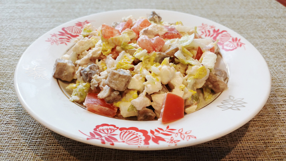 Теперь, когда все компоненты подготовлены, пришло время собрать салат. В глубокой миске соедините куриную грудку, обжаренные шампиньоны, сыр, помидоры и капусту. Добавьте приготванный соус и аккуратно перемешайте, чтобы все ингредиенты объединились.