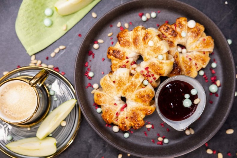 Яблоки очистить от кожуры и нарезать кольцами толщиной около 1 см, не забыв удалить сердцевину.В отдельной миске соединить белый и коричневый сахар с корицей, затем тщательно втереть смесь в каждой яблочной кольце.На рабочей поверхности, присыпанной мукой, раскатать размороженное слоеное тесто в пласт толщиной 5 мм.Свернуть тесто в рулет и нарезать его на полоски толщиной примерно 7 мм.Обмотать яблочные кольца полосками теста так, чтобы фрукты оставались видимыми.Выстелить противень пергаментом и разместить на нём приготовленные яблоки в тесте. Яйцо взбить до однородности и смазать каждый десертный кусочек. Посыпать коричневым сахаром, затем разогреть духовку до 180°С и выпекать 12 минут.После того как выпечка готова, украсить её сублимированной малиной и разноцветной посыпкой. Подавайте с джемом.Это простое, но невероятно вкусное лакомство обязательно станет любимым десертом на вашем столе. Приятного чаепития!