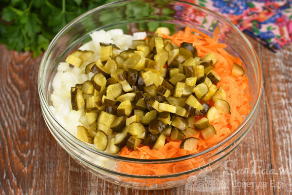 На следующем этапе следует добавить капусту (500 г) и соленые огурцы (2 шт.), предварительно нарезанные. Дайте всем ингредиентам соединиться, приправив специями по вкусу. Налейте рассол от огурцов и отправьте на медленный огонь на час. Как только все ингредиенты станут мягкими, добавьте нарезанный чеснок и зелень. Готовое блюдо не поспешите прятать, ведь его аромат завораживает!