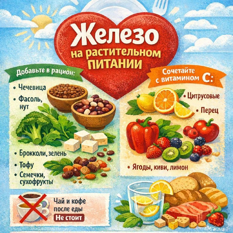 Следует также учитывать, что железо из растительных источников усваивается хуже, чем из животных. Поэтому сочетание этих продуктов с витаминами, особенно с витамином C, станет отличным решением. Вот что можно добавить в рацион: