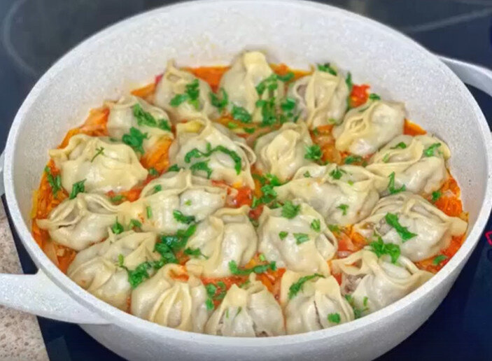 4. На сковороде разогреть масло и обжарить нарезанный лук, морковь и болгарский перец до мягкости. Затем добавить мелко нарезанные помидоры (можно использовать и размороженные) и немного воды. Аккуратно выложить манты в один слой, накрыть крышкой и готовить на медленном огне 10-15 минут. В конце приготовления посыпать зеленью.