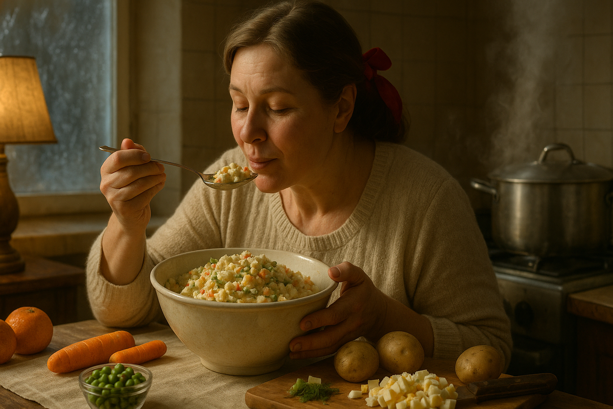 В то время как домашнее очаговое настроение подогревается горячей парой из кастрюль, на кухне начинают разворачиваться привычные ритуалы. Папы несут ёлку, а мамы, открыв шуршащие пакеты с овощами, готовят знаменитые «слои» для новогодних салатов. Как правило, в таких приготовлениях добавляется что-то особенное — немного любви, немного заботы и щепотка волшебства.