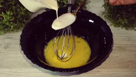 Первый этап — подготовка теста. В глубокой миске взбиваются яйца с добавлением соли до однородной массы. Затем вводится теплый кефир и все тщательно перемешивается. Из-за кефира тесто получается мягким и нежным.