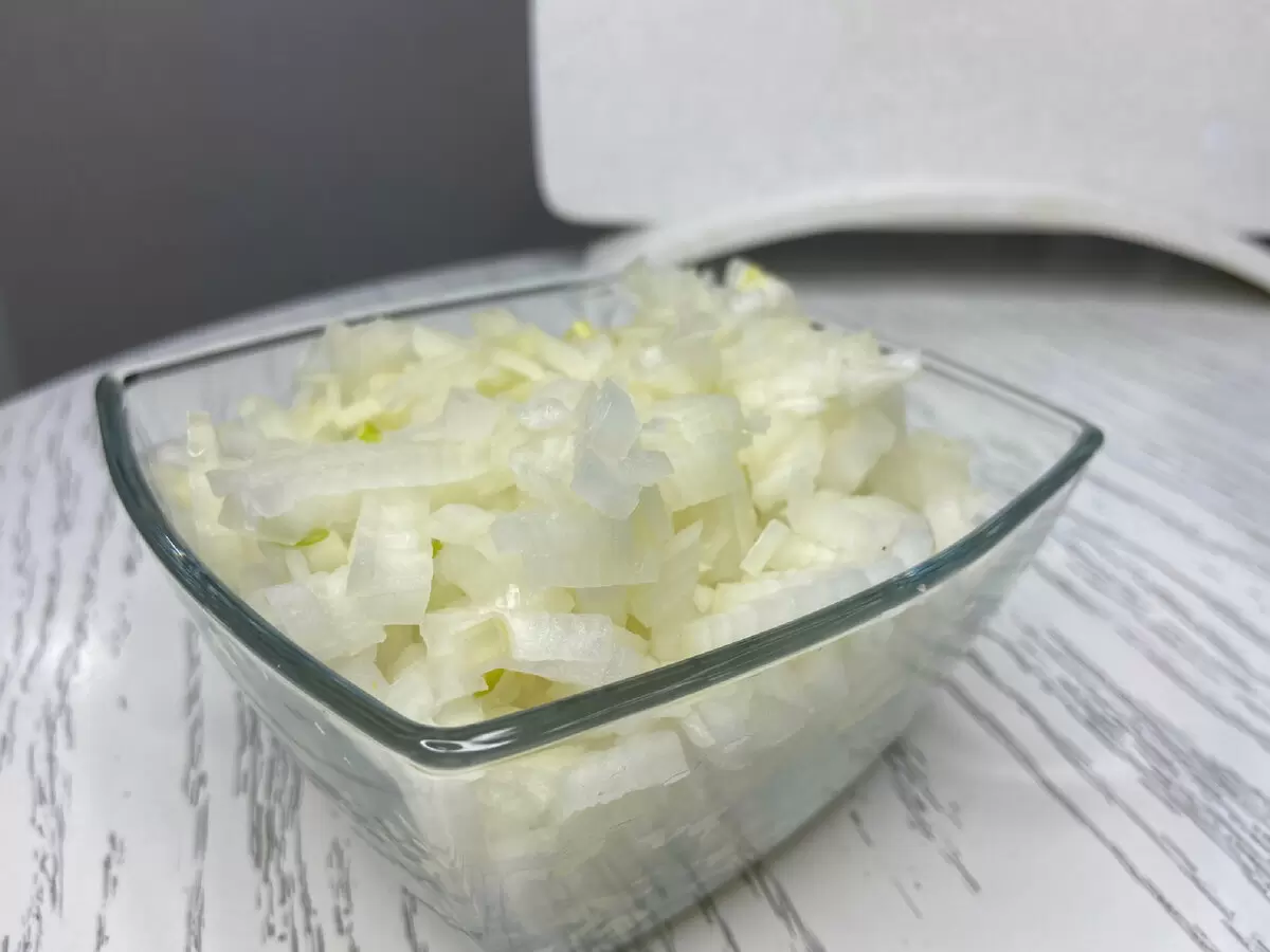 Первый шаг – это обработка лука. Он должен быть нарезан как можно мельче. Специальная техника нарезки может помочь избежать слез, и если у кого-то есть свои секреты, стоит поделиться ими. Например, многие умельцы рекомендуют не срезать корешок или использовать охлажденный лук.