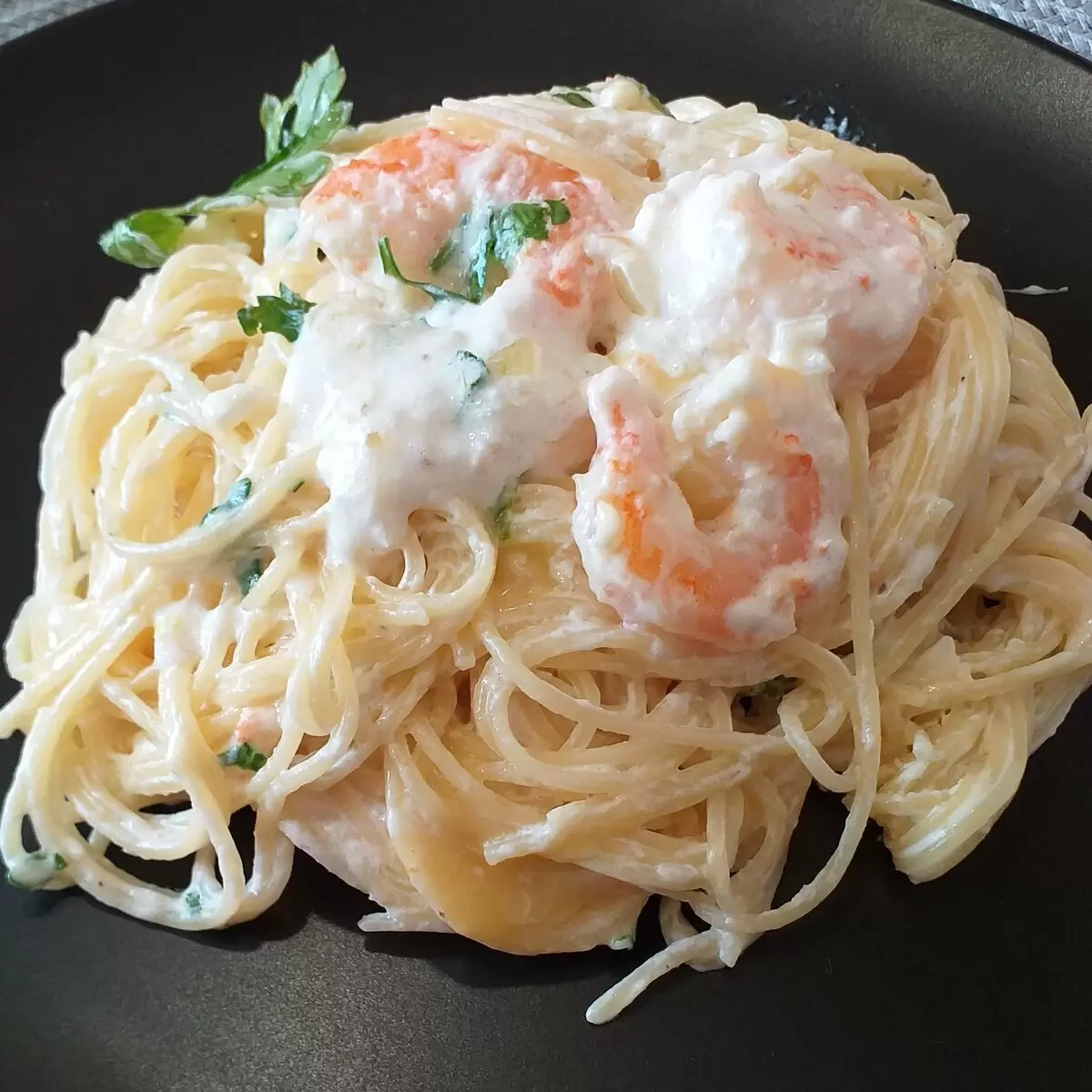 Спагетти с креветочным соусом готовы! Подавайте их к столу сразу, чтобы они не успели загустеть. Это сытный и вкусный ужин в истинно итальянском стиле!