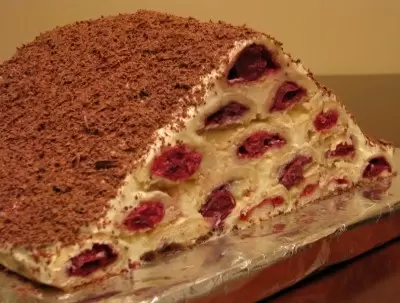 Можно экспериментировать с ягодами: красная смородина, клюква или брусника добавят кислинку и свежесть. Если ягод немного меньше, нижние трубочки получаются заметно короче и могут потребовать коррекции формы. Готовый торт охлаждают, после чего украшают тертым шоколадом и подают к чаю.