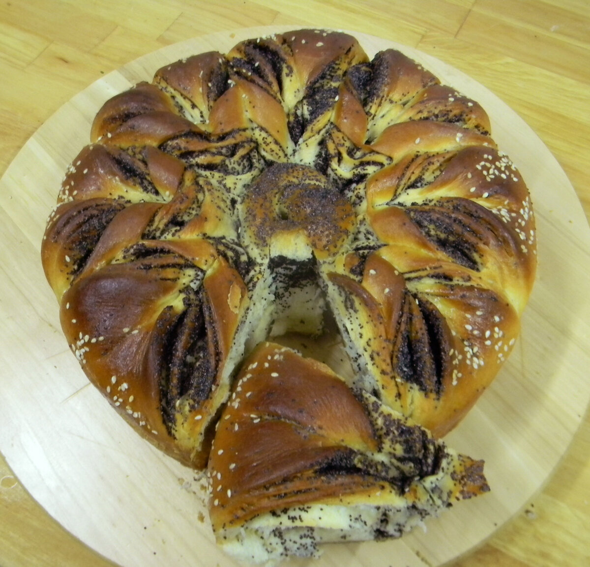 Из второй половины теста формируются 4 пласта с маковой начинкой, которые нарезаются на сектора. Все укладывается в форму, где создается оригинальный вид пирога.