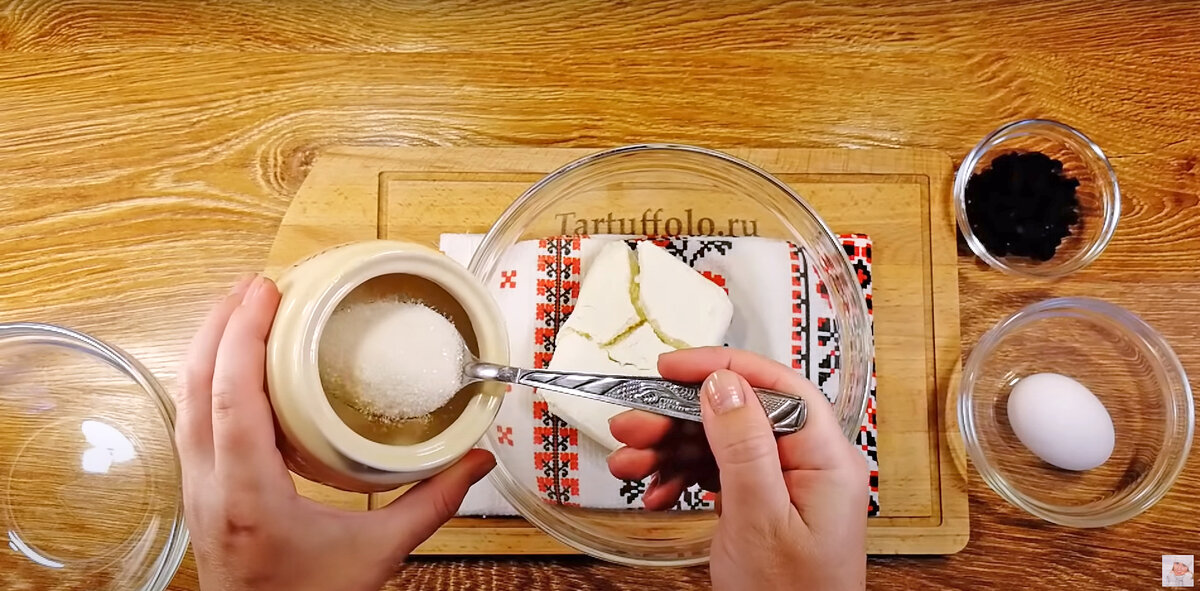 1. Начнем с творога: в 180 граммов добавьте столовую ложку сахара и чайную ложку ванильного сахара. Все тщательно перемешайте, чтобы получить однородную массу.