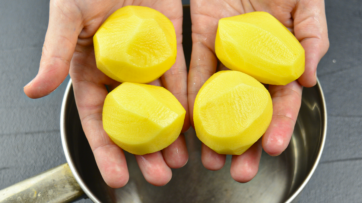 Начнем с подготовки ингредиентов. Очистите картофель, нарежьте его на небольшие кусочки и отварите до готовности на среднем огне — примерно 25–30 минут. Проверить готовность можно с помощью ножа. После варки слейте воду и сделайте пюре.