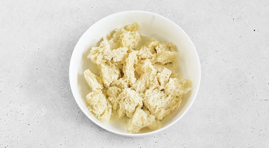1. Сначала важно подготовить хлеб: без корок нарезать его кусочками и замочить в молоке на 5 минут. После этого полученная масса тщательно разминается руками до однородности.