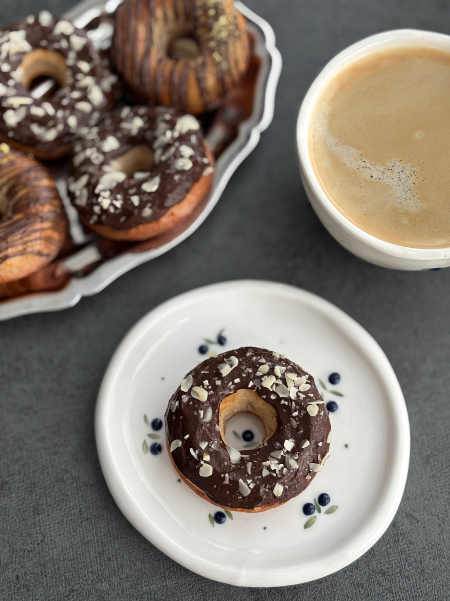 Смешайте какао и подсластитель, постепенно добавляя воду до достижения желаемой густоты. Нанесите глазурь на остывшие пончики и украсить по вкусу.