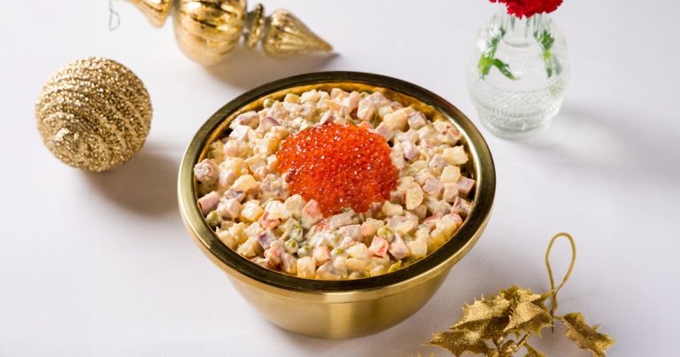 - Чтобы подчеркнуть лоску блюда, оно будет украшено горкой красной икры, превращая традиционный салат в настоящую арт-композицию.