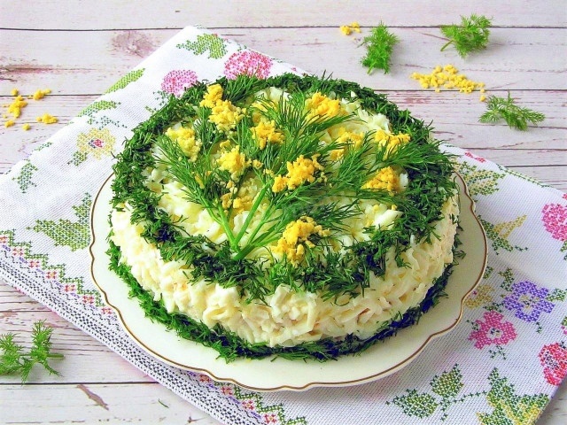 Салат покрывают майонезом и натирают белки, распределяя их по верхушке. В завершение можно украсить зеленью и оставшимся тертым желтком, имитируя веточку мимозы. Такая красота в холодильнике должна пропитаться в течение 1.5-2 часов.