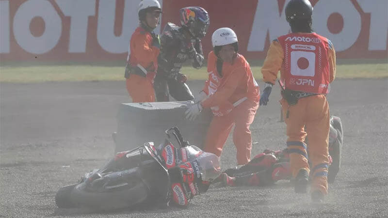 Испанский пилот команды «Aprilia» Хорхе Мартин столкнулся с неприятностями на Гран-при Японии в MotoGP, получив перелом ключицы во время сложного спринта. Авария произошла в самом начале гонки, что заставило Мартин отправиться в медицинский центр для срочного обследования.