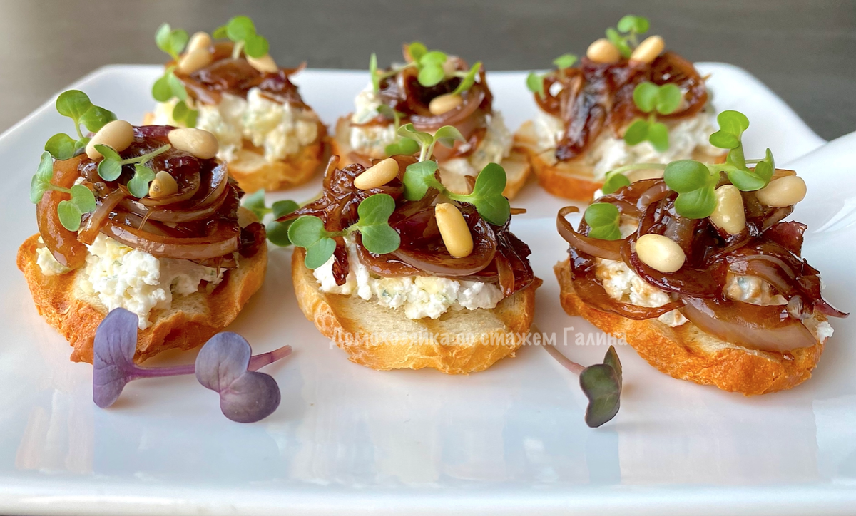 Нанесите сырную массу на подсушенные ломтики багета, сверху аккуратно добавьте луковый чатни. Привнесите завершенность блюду, украсив его кедровыми или грецкими орехами и микрозеленью. По желанию, добавьте немного меда для пикантности!