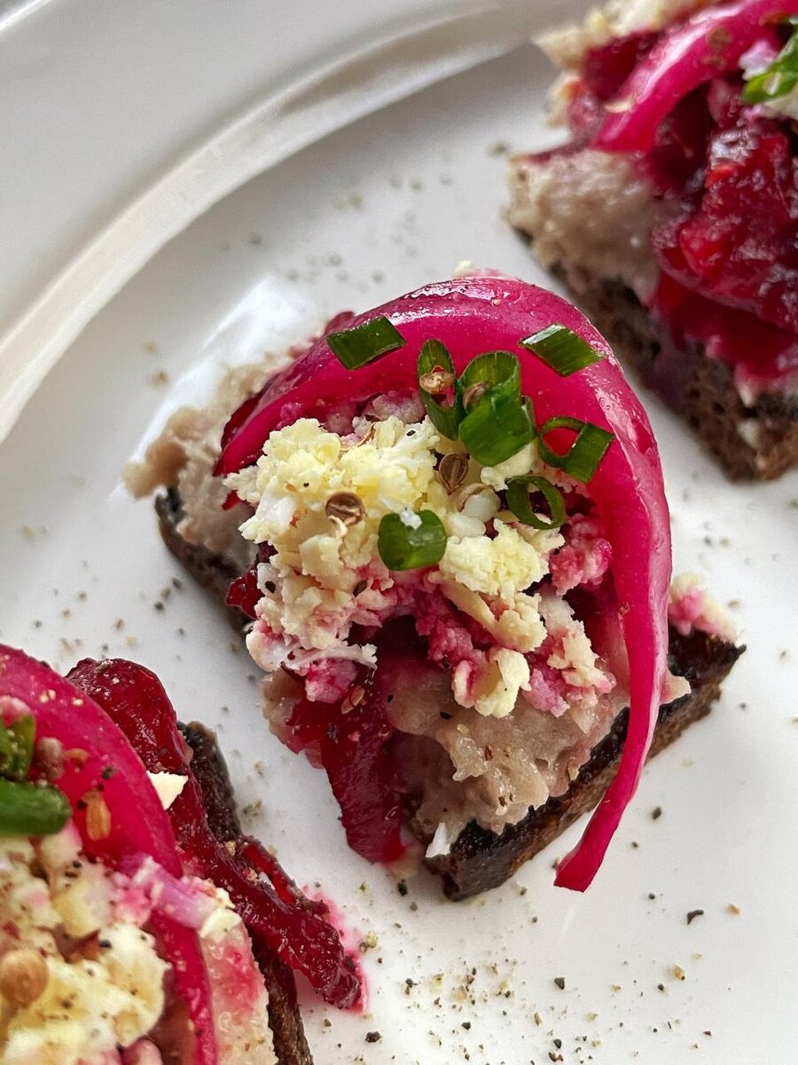 Собрать все вместе: на хлеб выложите форшмак, сверху посыпьте натертыми яйцами, зелёным луком и маринованным луком с ягодами. Добавьте немного кориандра и свежемолотого перца для аромата. Наслаждайтесь изысканным вкусом этого блюдо и угощайте своих близких!