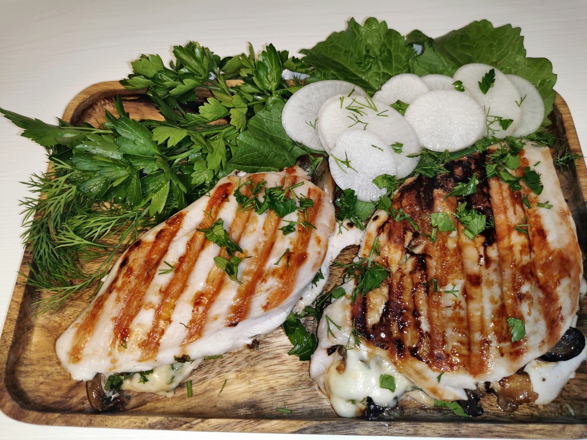 Нежные и сочные куриные кармашки с грибами и сыром идеально подойдут к свежим овощам и зелени. Блюдо станет ярким акцентом вашего вечера на природе!