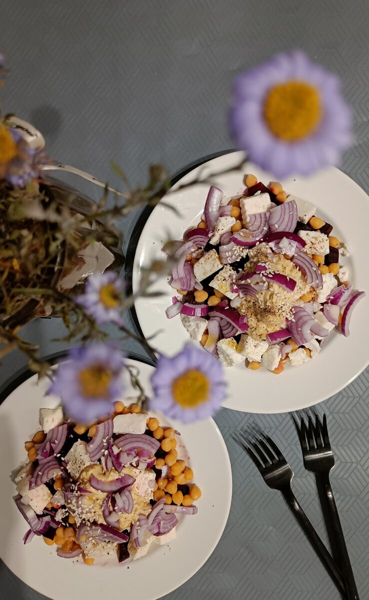 Свёклу, сыр и лук следует нарезать, а затем аккуратно выложить в глубокую тарелку. Сверху посыпьте нутом и кунжутом, заправьте оливковым маслом, а затем добавьте соль и перец по вкусу. Этот простой процесс подарит вам не только сытное, но и невероятно яркое блюдо.
