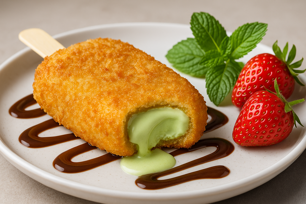 - Мороженое в кляре. Замороженные шарики обваливаются в панировке и быстро обжариваются, создавая контраст горячего и холодного.