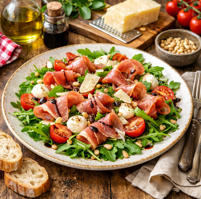Сегодня мы представляем вам рецепт, который привнесет атмосферу солнечной Италии прямо на ваш стол. Итальянский салат с прошутто и рукколой — это не просто сочетание ингредиентов, а настоящая симфония вкусов, где свежесть и легкая пикантность встречаются с тонкими солеными нотами.