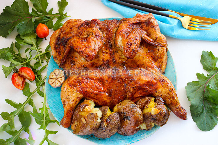 Курица трижды открывается вниманию: промаринованная смесь солёных и сладких нот пропитывает кожу, а затем равномерная раскладка по форме туши помогает запечься целиком без пересушивания. Небольшой штрих — разбивка вдоль грудки и легкое отбивание — делает тушку более гибкой для тепловой обработки.