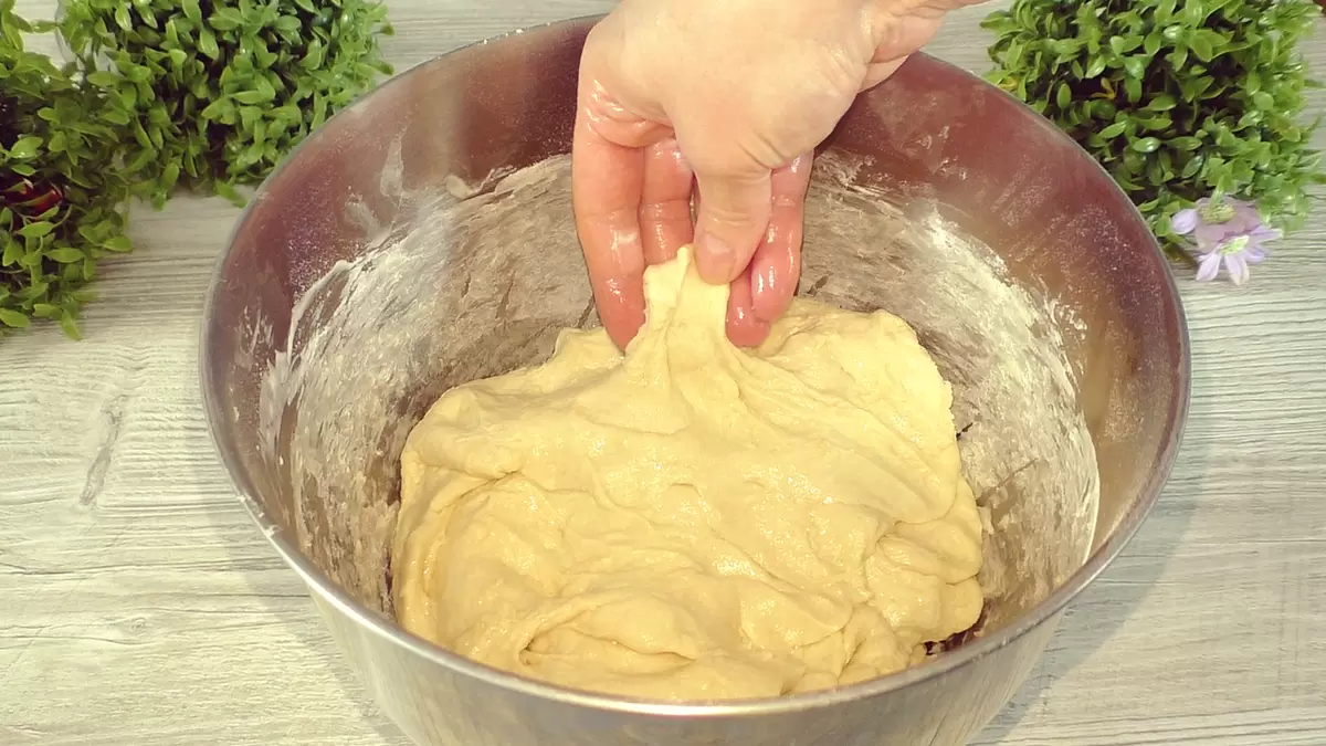 Муку нужно добавлять постепенно, в среднем потребуется около 950 граммов. Главное, чтобы тесто оставалось эластичным и не было пересыпано мукой, иначе пирожки потеряют свою пышность. После замеса тесто накрывается пленкой и оставляется на 20 минут.