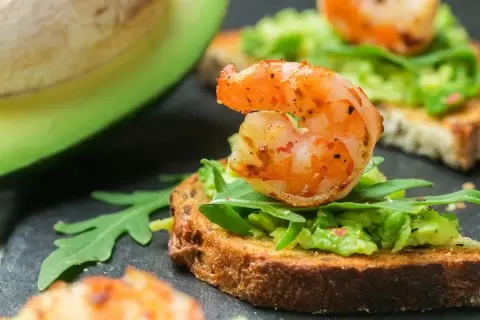 Обжарьте тосты в тостере до хрустящей корочки. На каждый кусочек хлеба выложите ложку соуса, сверху положите креветку и украсить свежей зеленью. Эти канапе не оставят равнодушными ни одного гостя и создадут атмосферу праздника!
