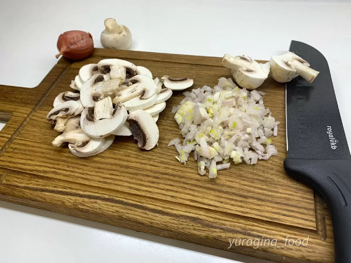 Первым делом нужно мелко нарезать лук, а грибы — шампиньоны — очистить и нарезать крупно.
