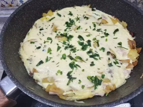 Когда картошка станет мягкой по краям, добавьте ветчину и продолжайте жарить, пока она тоже не подрумянится. В это время в отдельной миске взбейте яйца с добавлением соли и, по желанию, щепотки черного перца. Позже, когда картофель и ветчина будут готовы, следует залить яичной смесью, равномерно распределив по поверхности. Уменьшите огонь, накройте крышкой и дайте блюду готовиться до полной зрелости, добавив сверху тертый сыр — он расплавится и создаст удивительный аромат.