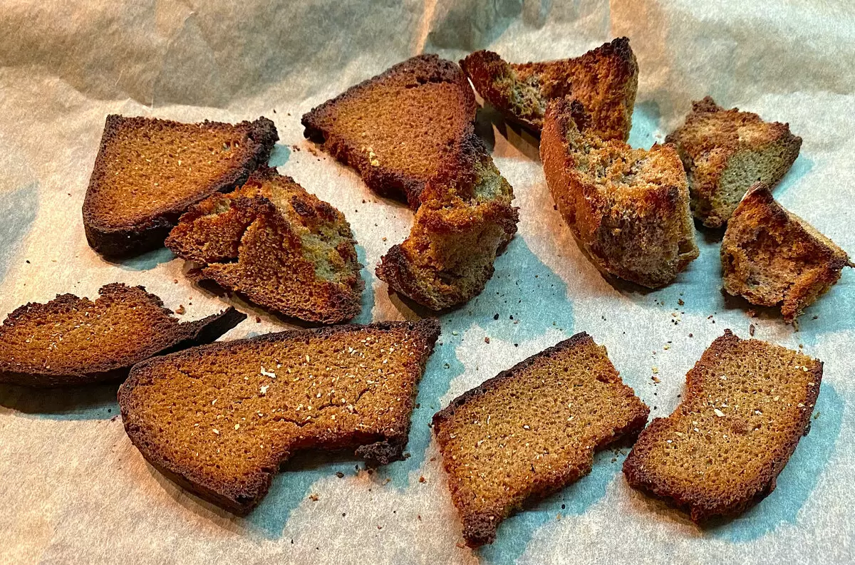 Первым делом, нужно разложить подсохший ржаной хлеб на противне и запечь его до золотистой корочки. Эти слегка подгоревшие кусочки придадут квасу насыщенный вкус. Затем следует поместить их в трехлитровую банку.