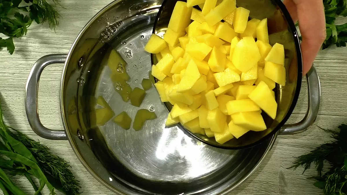 Как только вода закипела, отправляем в нее нарезанный картофель.