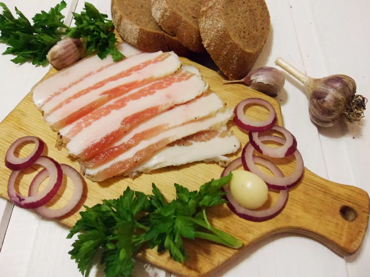 Подбор сала также важен. Оно должно быть белым с небольшой мясной прослойкой и мягкой шкуркой. Чтобы проверить свежесть, можно проткнуть сало ножом — если он проходит легко, значит, продукт идеально подходит для засолки.