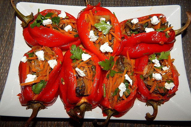 3. Фаршировка: К обжаренным овощам добавить грибы и соль по вкусу, тщательно перемешать и добавить измельченную петрушку. После этого очистить запеченный перец от кожуры, аккуратно вырезать семена. Фаршировать перцы приготовленным овощным миксом и крошеным сыром фета.