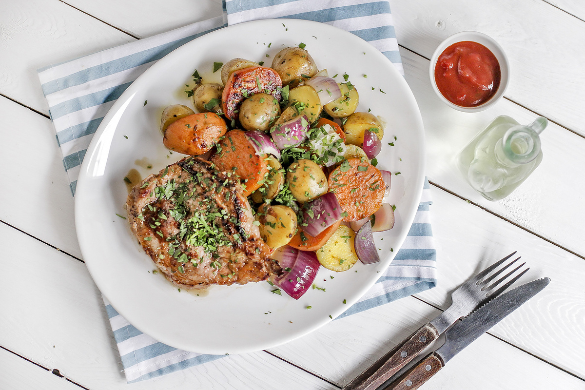 Пора побаловать себя настоящим кулинарным шедевром! В этом рецепте сочетаются нежные стейки свинины, замаринованные в ароматном соусе барбекю, и полезные гарниры из картофеля и батата. Этот здоровый обед не только порадует вкусом, но и станет украшением любого стола.