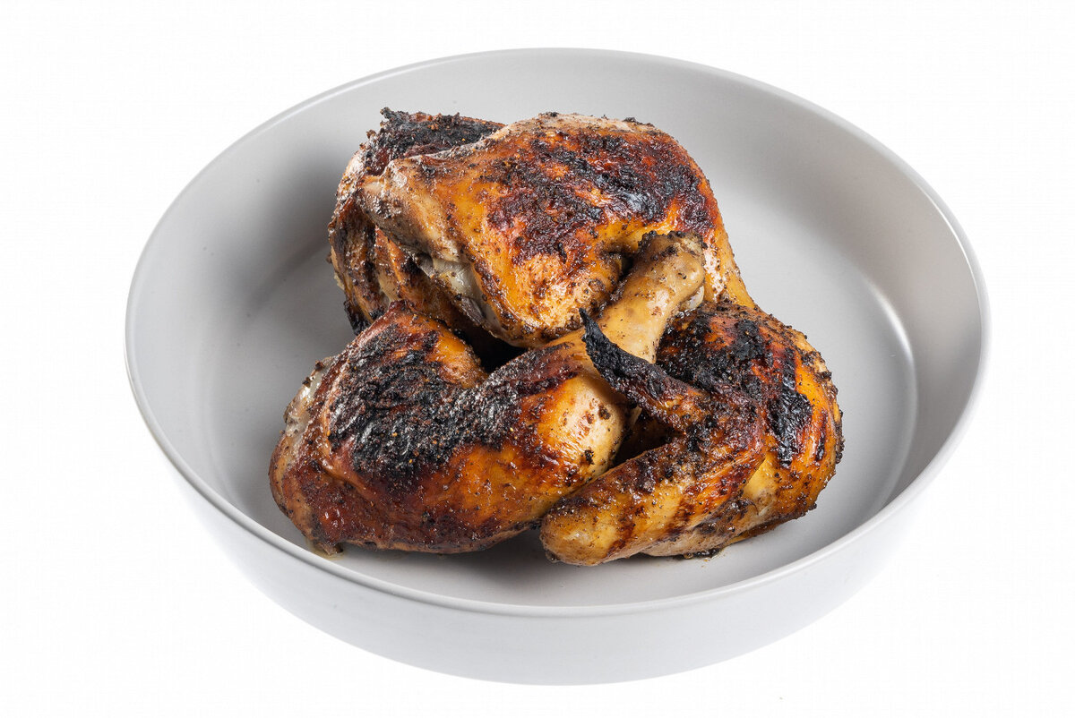 Разделить цыпленка на четыре части и выложить в широкую емкость, добавив один лавровый лист. Чеснок измельчить с солью и двумя столовыми ложками воды в блендере, затем влить апельсиновый сок, хересный уксус, черный перец, вустерширский соус и душистый перец. Перемешать до получения однородной пасты.Переложить полученный маринад к цыпленку и тщательно нанести его на все кусочки, лучше сделать это вручную. Затем накрыть емкость пленкой и убрать в холодильник на минимум 4 часа, а лучше на ночь.Разогреть гриль. Извлечь куски цыпленка из маринада, стряхнуть лишнюю смесь (чтобы избежать горения) и обжарить на гриле в течение 25 минут до образования золотистой корочки, периодически переворачивая. Дать немного остыть в течение 10 минут и подавать к столу. В домашних условиях цыпленка можно поджарить на сковороде-гриль, а затем запекать в духовке, разогретой до 180 градусов, на протяжении 40-45 минут.